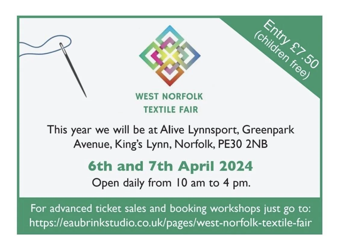 West Norfolk Textile Fair Saturday 6 April 2024 10:00 Sunday 7 April 2024 16:00 Kings Lynn (map) Google Calendar ICS